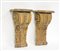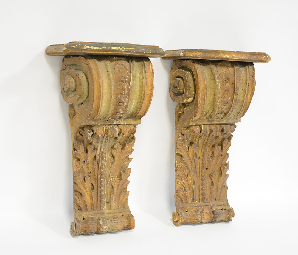 Coppia di mensole in legno intagliato, laccato e dorato a fregi, foglie e perlinature. Secolo XVII (cm 30x50x17) (difetti e restauri)