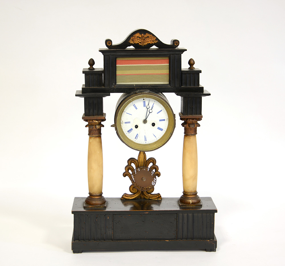Pendola da tavolo di struttura architettonica con colonnine tornite in alabastro, quadrante in smalto bianco con numeri romani, lancette breguet. Movimento con carica manuale, suoneria delle ore e delle mezze su gong .(cm 33x50)(difetti, mancanze e sostituzioni)