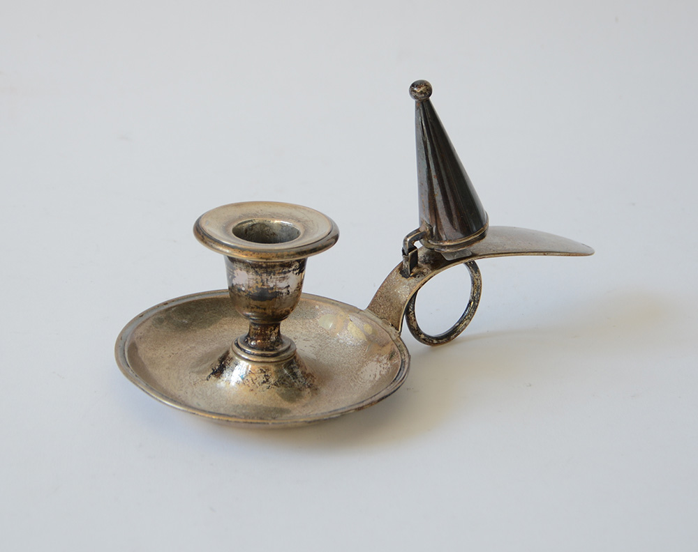 Bugia in argento con spegnimoccolo. Argentiere marchio RG (g 212 lordi ca.)