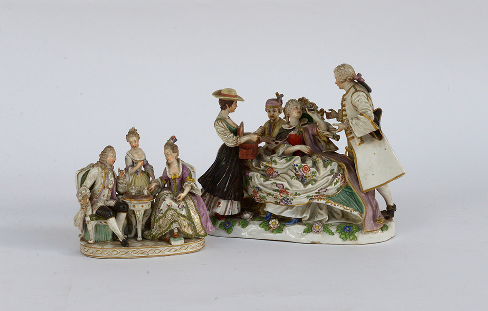 Lotto composto da due gruppi in porcellana policroma raffiguranti scene galanti, manifatture, epoche e misure diverse (difetti, restauri e mancanze)