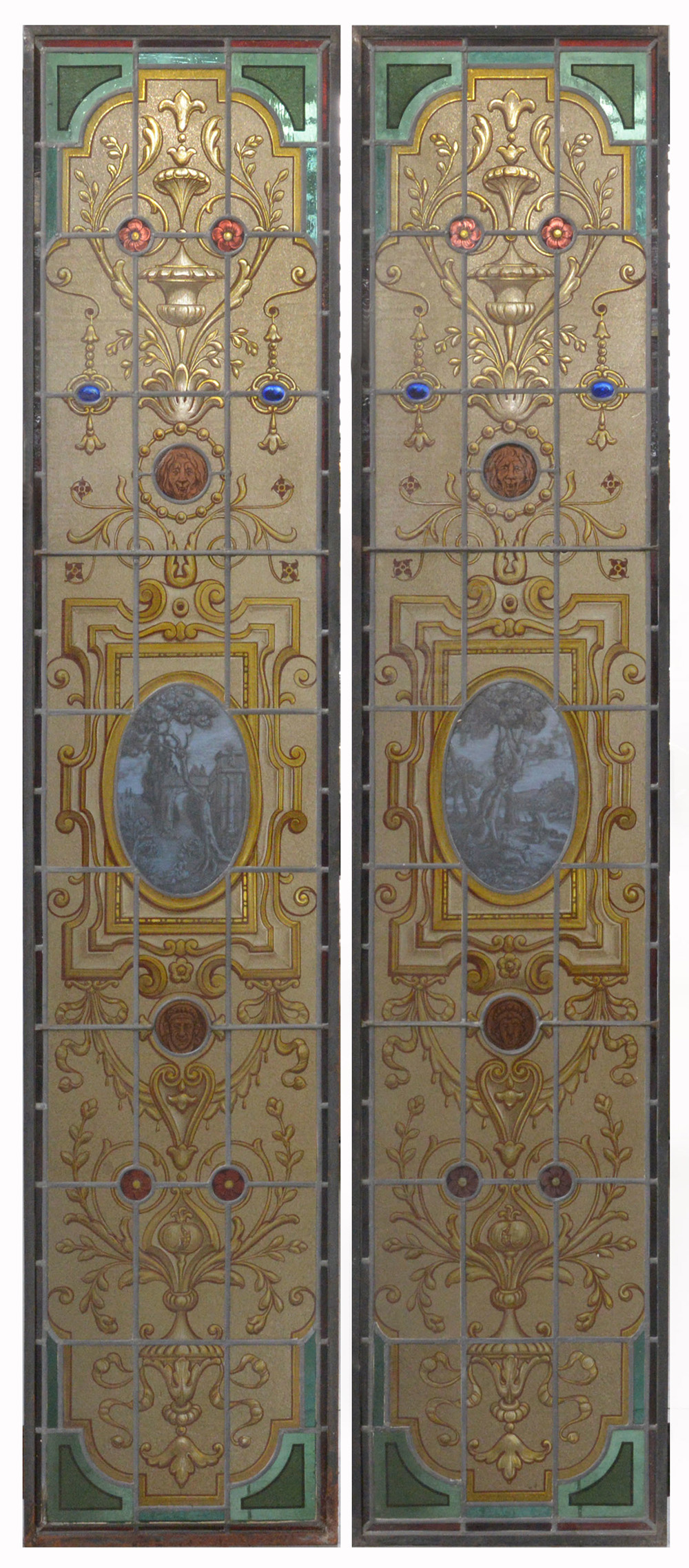 Coppia di vetrate con vetri policromi legati al piombo (cm 206x43) (difetti)