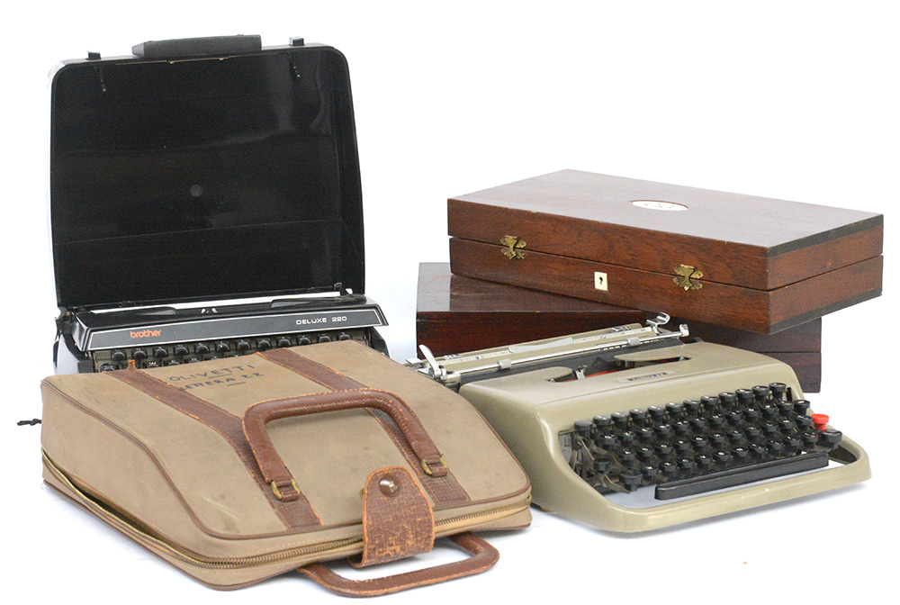 Lotto coposto da due scatole in legno con coperchio e due macchine da scrivere in custodia (difetti e mancanze)