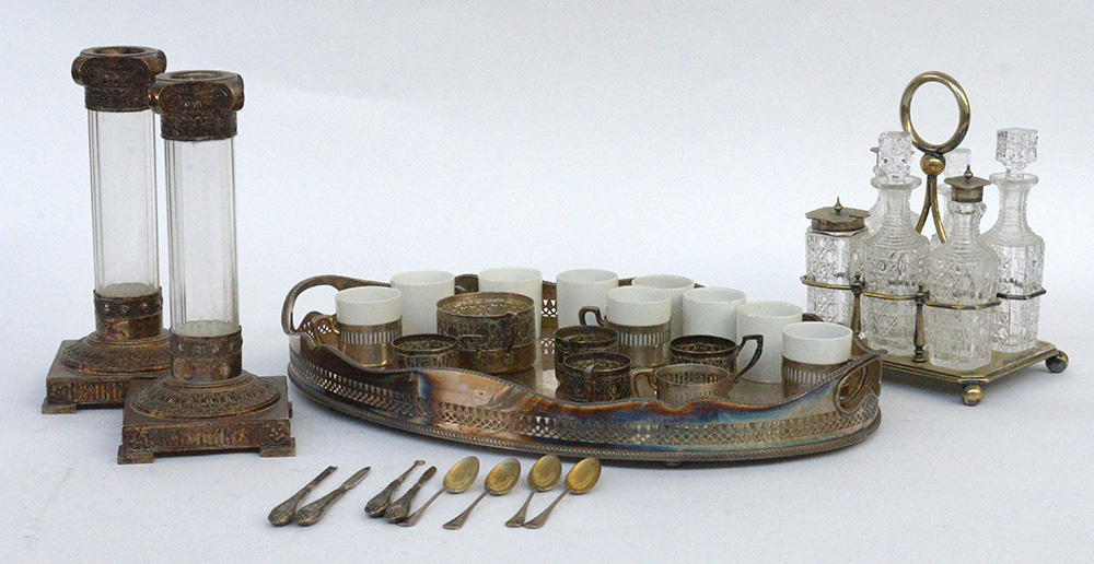 Lotto composto da un servizio da tavola in sheffield con boccette in vetro, un vassoio biansato e due candelieri in metallo argentato e vetro un porta zuccheriera, otto portatazzine, quattro cucchiaini e quattro accessori da toelette in argento e lamina d'argento ,, uniti a nove tazzine in porcellana (difetti e mancanze)