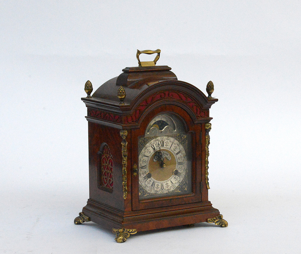Orologio in legno d'appoggio in stile bracket clock di fattura recente. Movimento con carica settimanale suoneria delle ore e delle mezze su campanello, scappamento a bilanciere, quadrante a fascia con numeri romani e fasi di luna (H cm 32 circa)