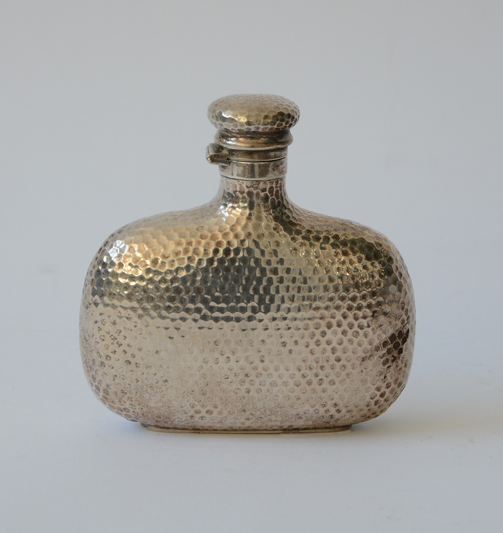 Bottiglia porta liquore in argento martellato. Argentiere A. Giacchè, Milano (g 148 ca.)