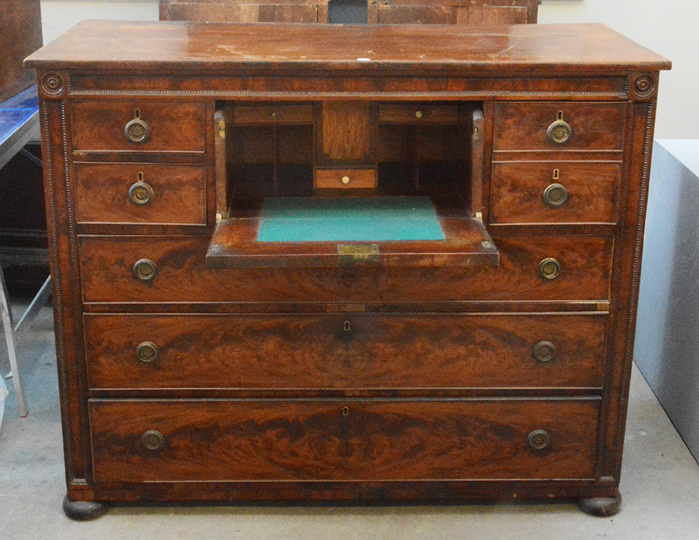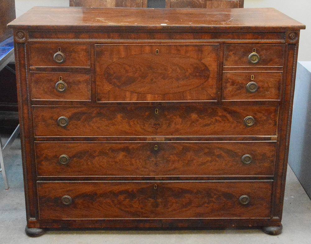 Cassettone lastronato con fronte a otto cassetti e piedi a cipolla. Cassetto centrale con scarabattoli. Secolo XIX (cm 133x108,5x58x5) (difetti)