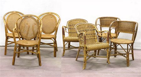 Lotto composto da due coppie di poltrone e tre poltrone da esterno in manao, malacca e giunco (difetti e mancanze)