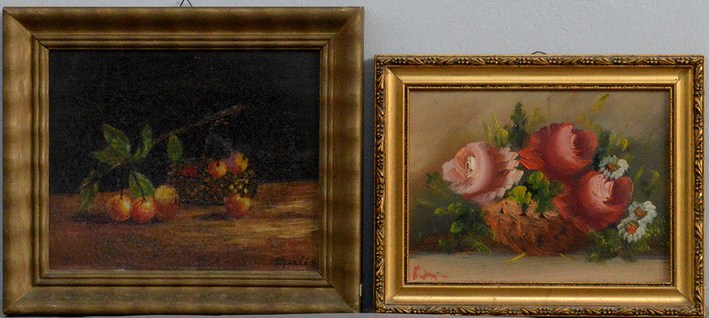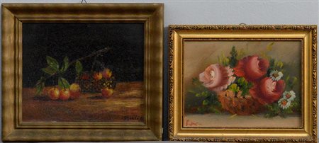 Lotto composto da due dipinti ad olio raffiguranti nature morte con fiori e frutta, firmati, misure diverse, in cornici.