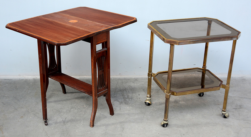 Lotto composto da un tavolino ad alette inglese ed un carrello a due piani in vetro e ottone (difetti)