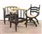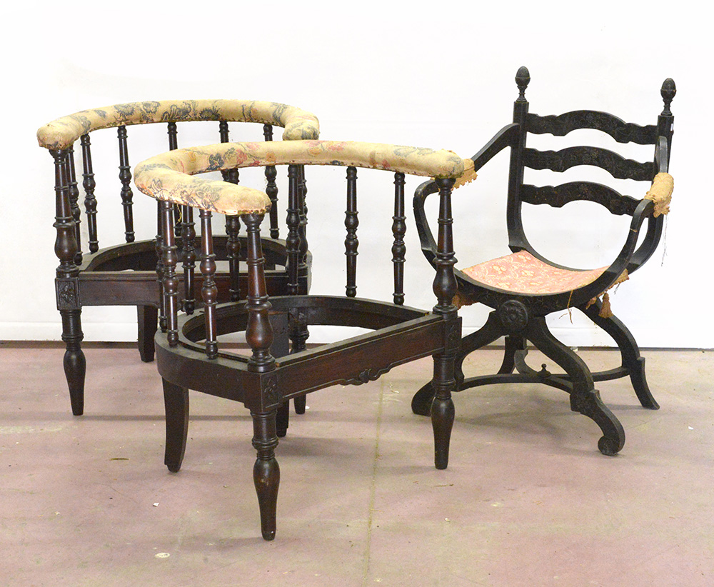 Lotto composto da una coppia di poltroncine a pozzetto con schienale a listelli ed una piccola in stile Savonarola (difetti e mancanze)