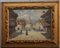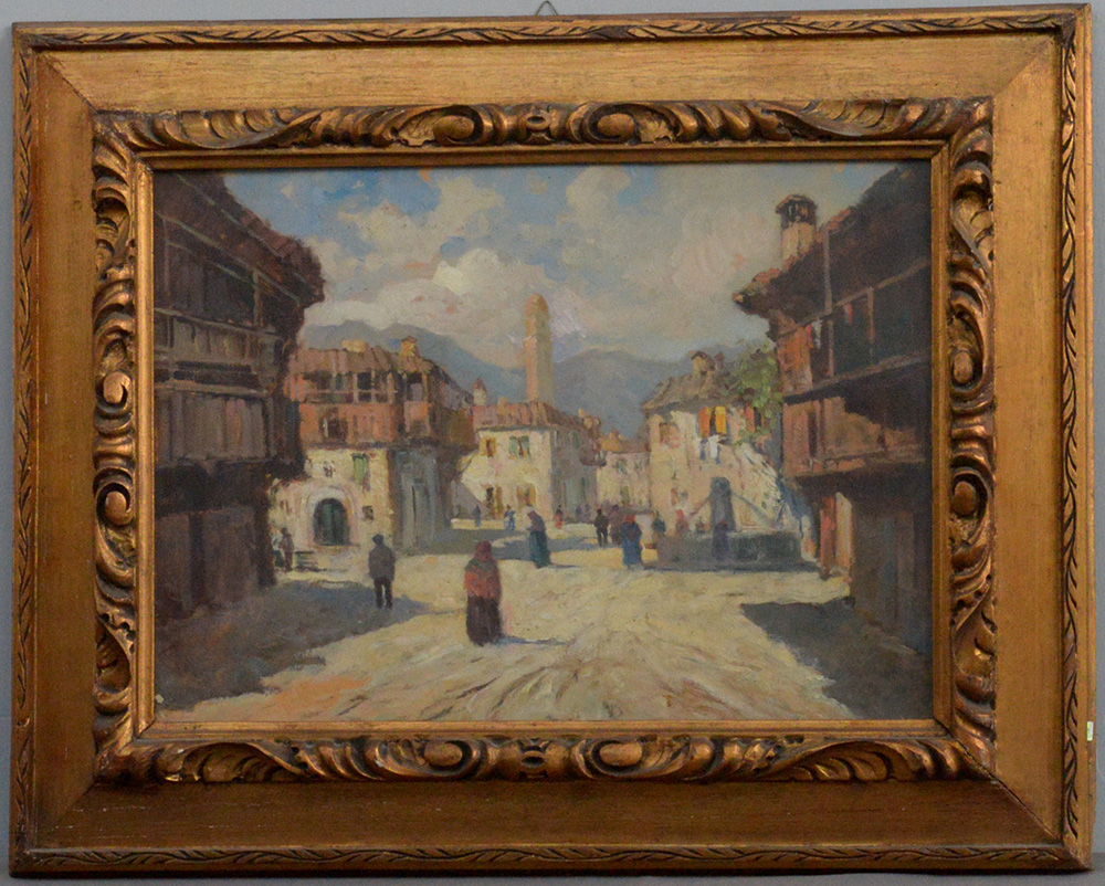 Ignoto "Scorcio di paese con campanile e figure" olio su cartoncino pressato (cm 50x70) in cornice