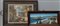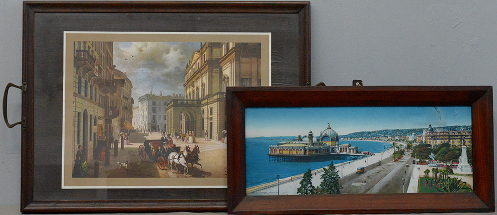 Lotto composto da un vassoio con una riproduzione di uno scorcio di Milano ed una riproduzione di una veduta di Nizza, in cornice (difetti)