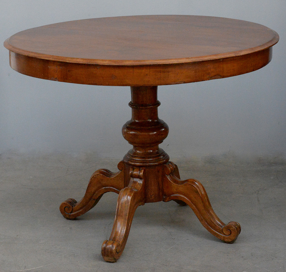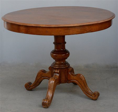 Tavolo tondo con gamba centrale tornita terminante a quattro piedi intagliati e sagomati (cm d 96, h 80)(difetti)