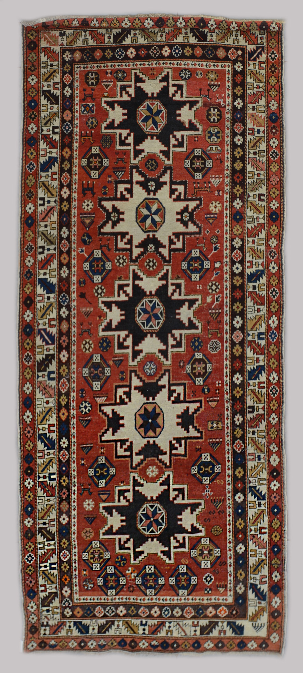 Tappeto Schirwan Lesghi, Caucaso fine del secolo XIX. Disegno a croce di Sant’Andrea nei toni del bianco e marrone su fondo rosso (cm 290 x115) (difetti)