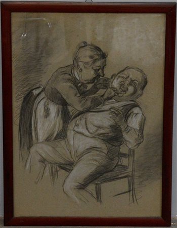 Firma indecifrata "La barbiera" 1905 disegno a carboncino e biacca su carta...