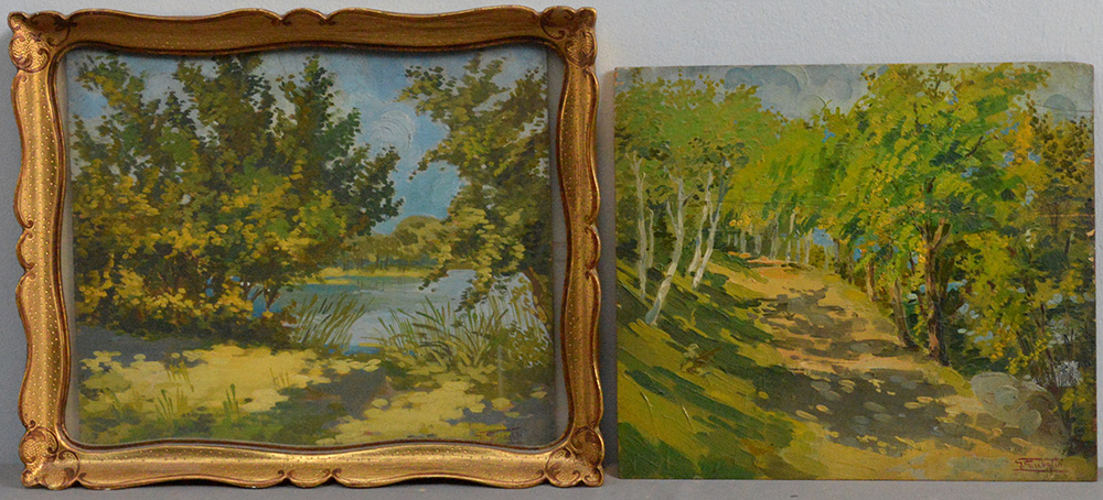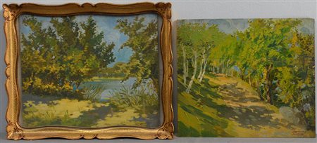 "Paesaggi boschivi con corsi d’acqua" due olii su compensato, firmati in basso a destra, misure diverse, di cui uno in cornice.