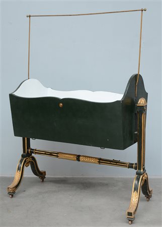 Culla basculante in legno laccato verde con fregi e scanalature dorate. Secolo XIX