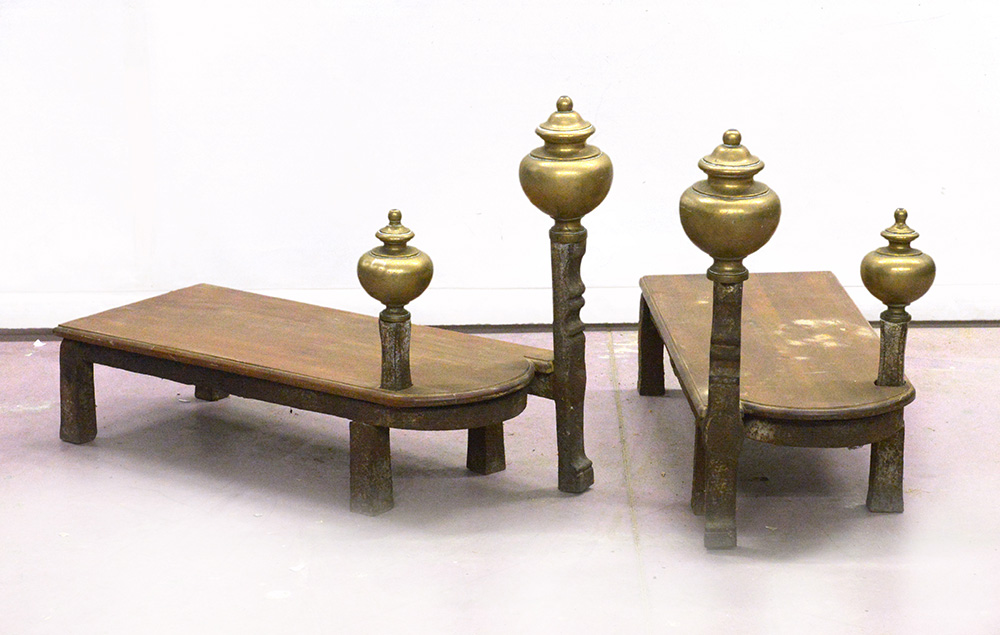 Coppia di antichi alari in ferro battuto con pomoli in bronzo tornito, montati con pianetti in legno di epoca posteriore (difetti)