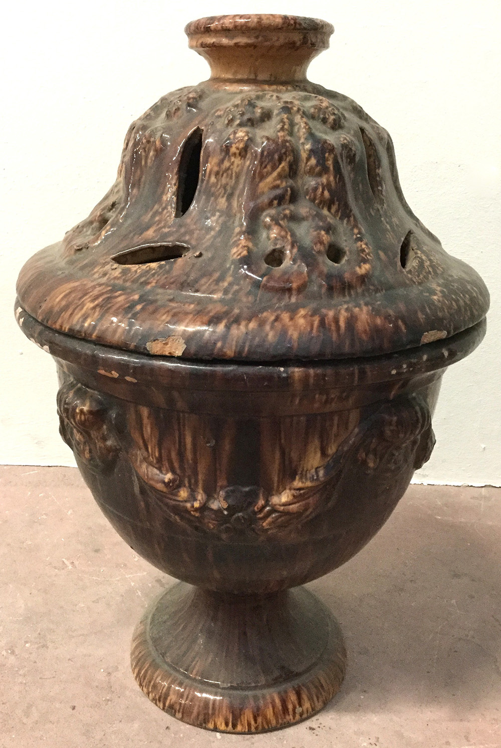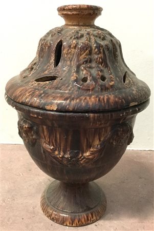 Vaso con coperchio in terracotta smaltata con fascia decorata a festoni (h cm 56) (difetti)