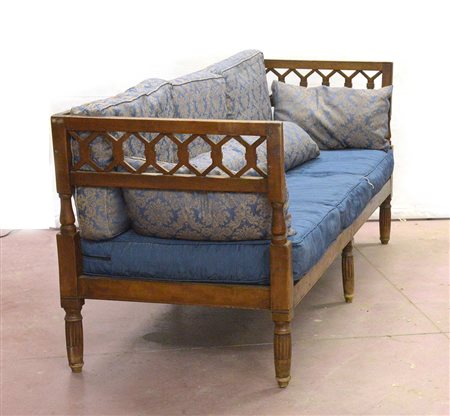 Divano a tre posti in stile Luigi XVI con schienale traforato, gambe tornite...