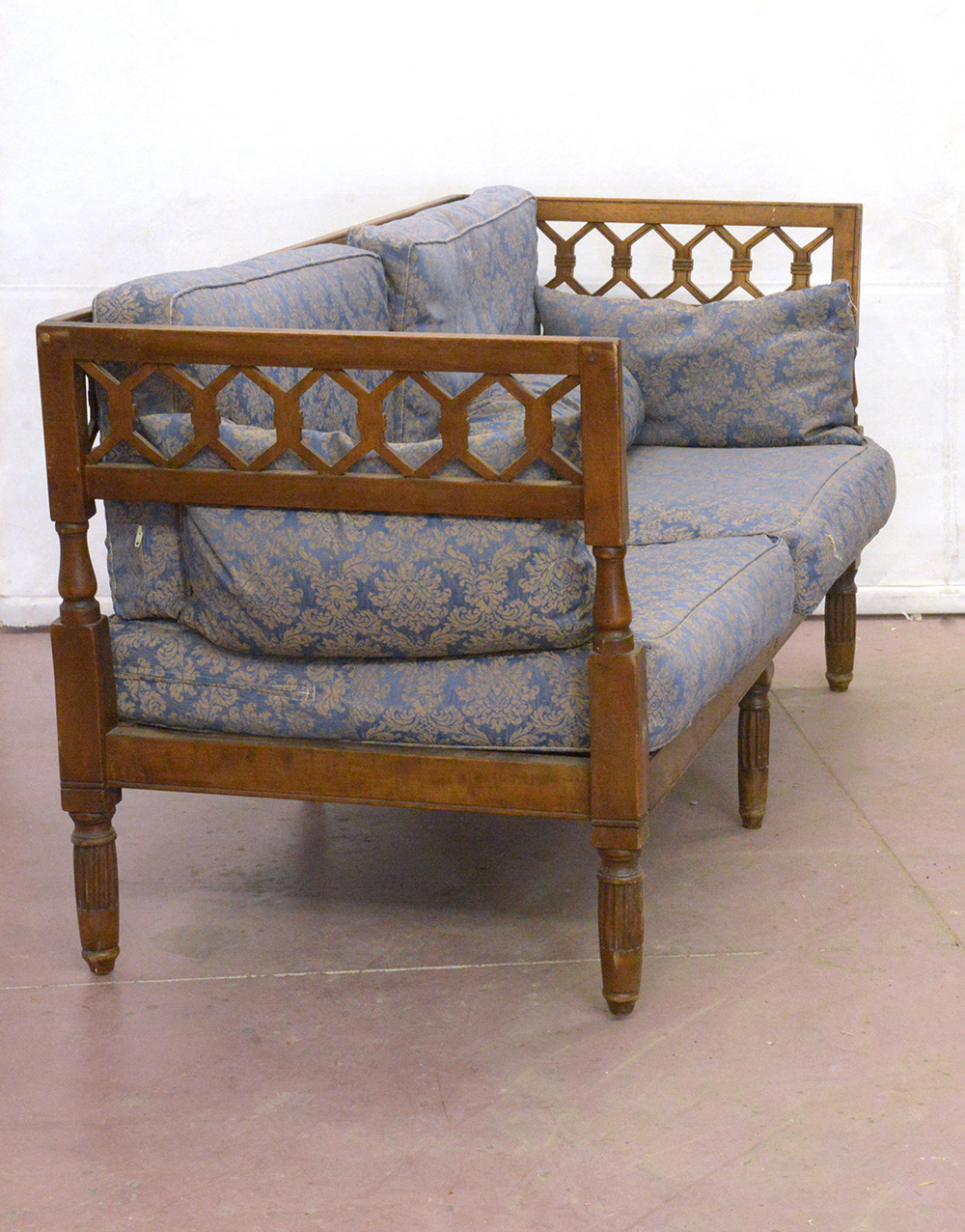 Divano a due posti in stile Luigi XVI con schienale traforato, gambe tornite...