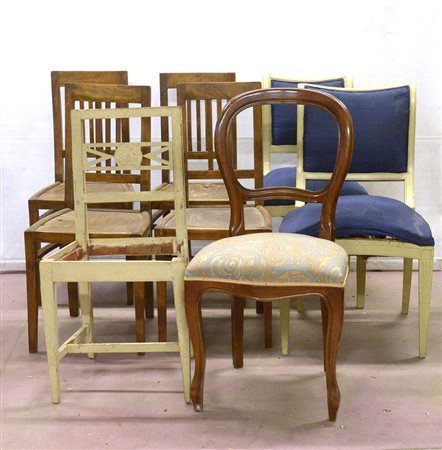 Lotto composto da otto sedie in legno di diverso decoro ed epoca (difetti e...