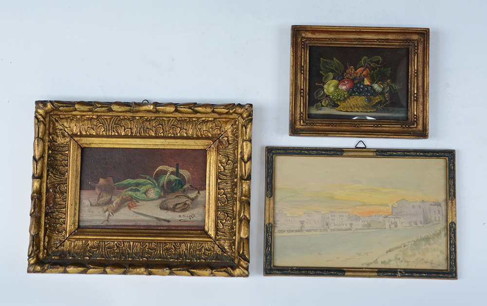 Lotto composto da tre piccoli dipinti, uno raffigurante natura morta firmato Sicard, uno raffigurante un cesto di frutta e un'acquerello raffigurante tramonto (max cm 12x20)