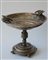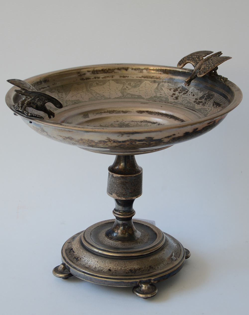 Alzata in argento con corpo inciso a foglie d'edera e fiori decorati a rilievo a tutto a volatili (gr 560 ca) (difetti)