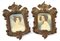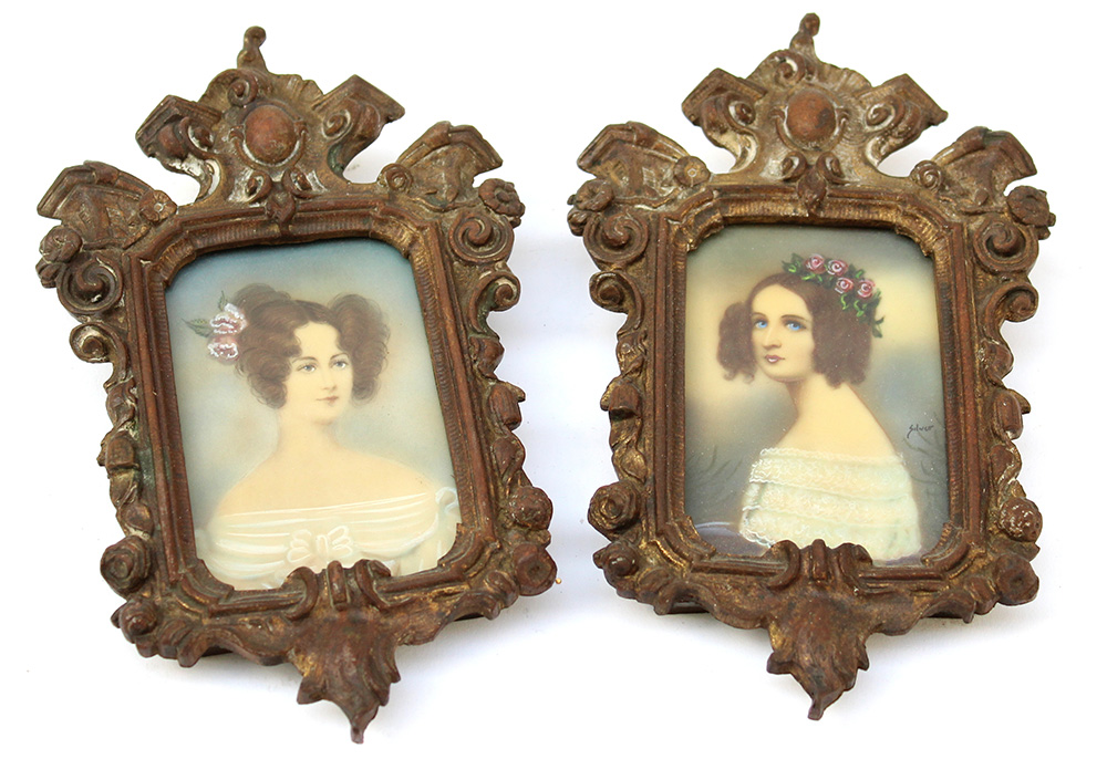 Coppia di piccole cornici in bronzo decorate a fregi e volute in rilievo, contenenti fotominiature ritoccate (lievi difetti)