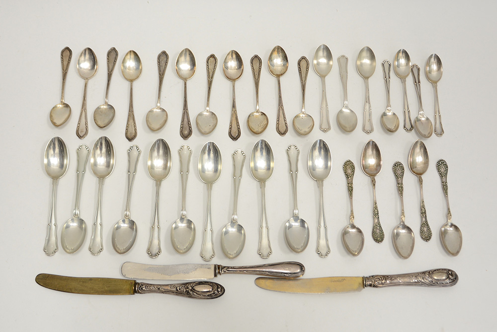 Lotto composto da numerosi cucchiaini diversi in argento uniti a tre coltellini laminati (gr 400 ca) (difetti)