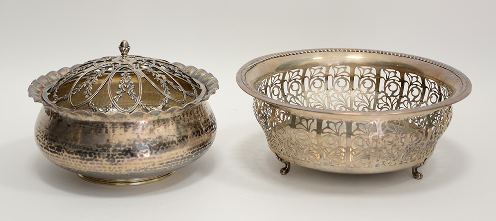 Lotto composto da un porta potpourri e un'alzata in argento sbalzato e traforato, misure diverse (gr 800 ca)