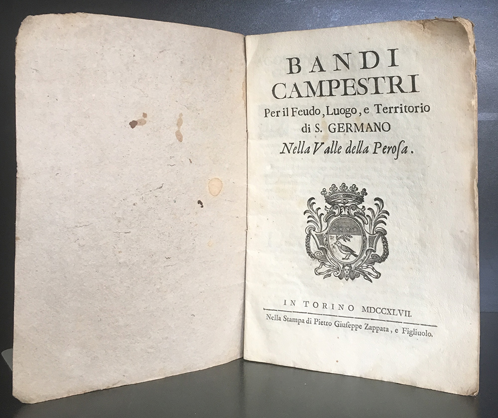Bandi campestri per il feudo, luogo e territorio di S. Germano nella valle della Perosa. Torino: Giuseppe Zappata e figlio, 1747. 8bo, cartone coevo. Non collazionato e difetti da esaminare.