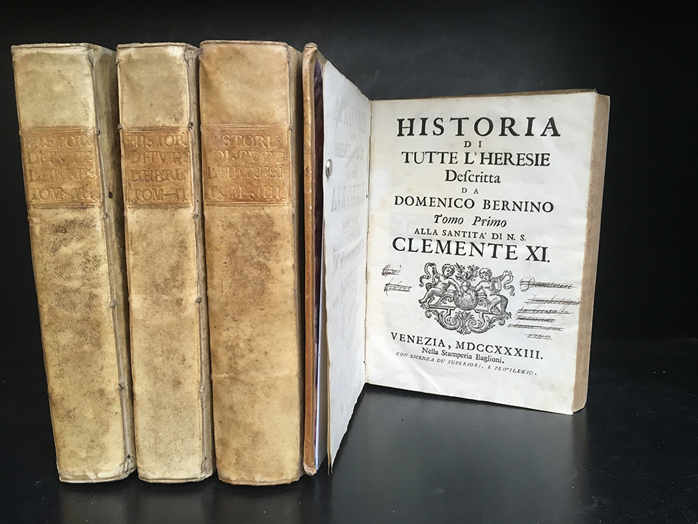 BERNINO D. Historia di tutte l'Heresie. Venezia: Baglioni,1733. 4to, 4 voll. vignette al frontespizio, legatura coeva in piena pergamena con titiolo su tassello al dorso. Non collazionato e difetti da esaminare.