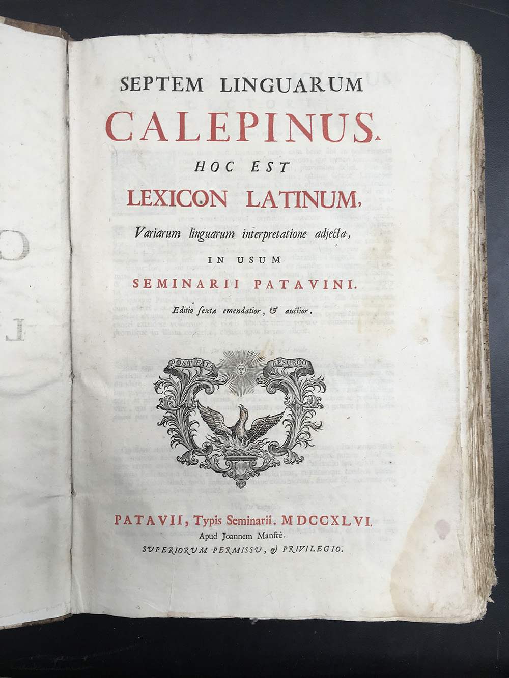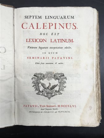 CALEPINO A. Septem linguarum Calepinus, hoc est Lexicon Latinum. Padova: Tipografia del Seminario, 1746. 2 volumi in folio, frontespizio in rosso e nero. Non collazionato e difetti da esaminare.