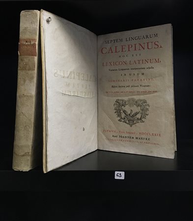 CALEPINO A. Septem linguarum, hoc est lexicon Latinum, variarum linguarum interpretatione adjecta, ad usum Seminarii Patavini. Padova: Manfré, 1779-78. 2 volumi, folio, pergamena coeva con titolo in oro su tassello al dorso. Non collazionato e difetti da esaminare.