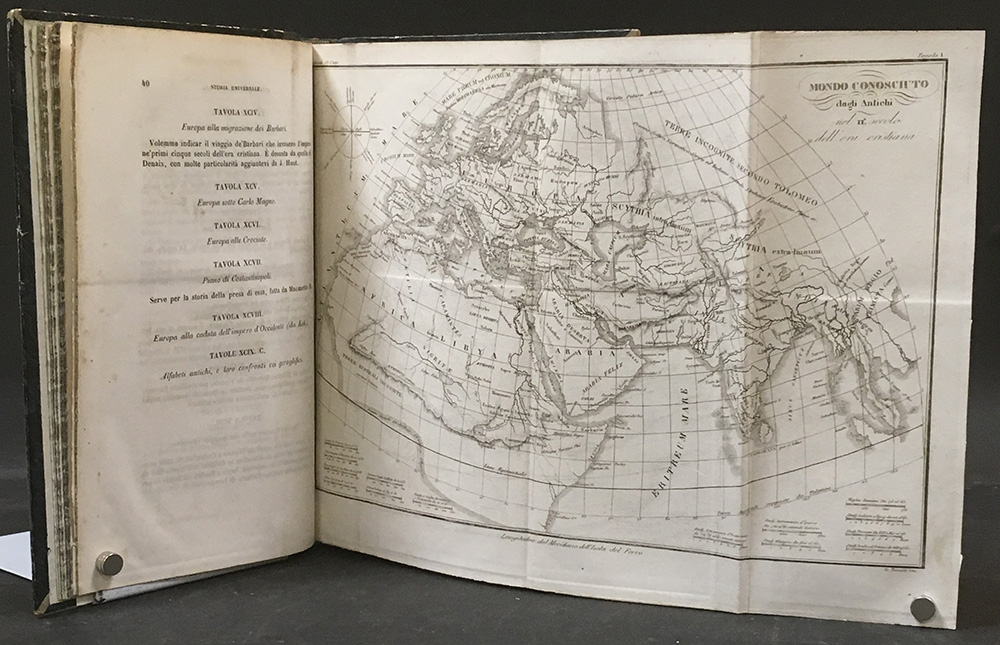 CANTU', Cesare. Tavole per l’illustrazione della storia universale. Torino,: Pomba, 1846. 8vo, 100 tavole di cui alcune ripiegate. Rilegatura in mezza pelle con titolo e decori in oro al dorso . Non collazionato e difetti da esaminare.