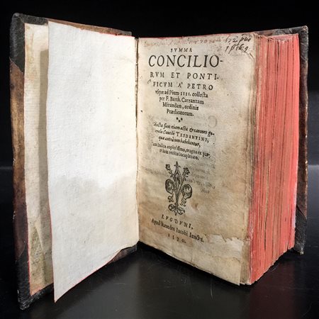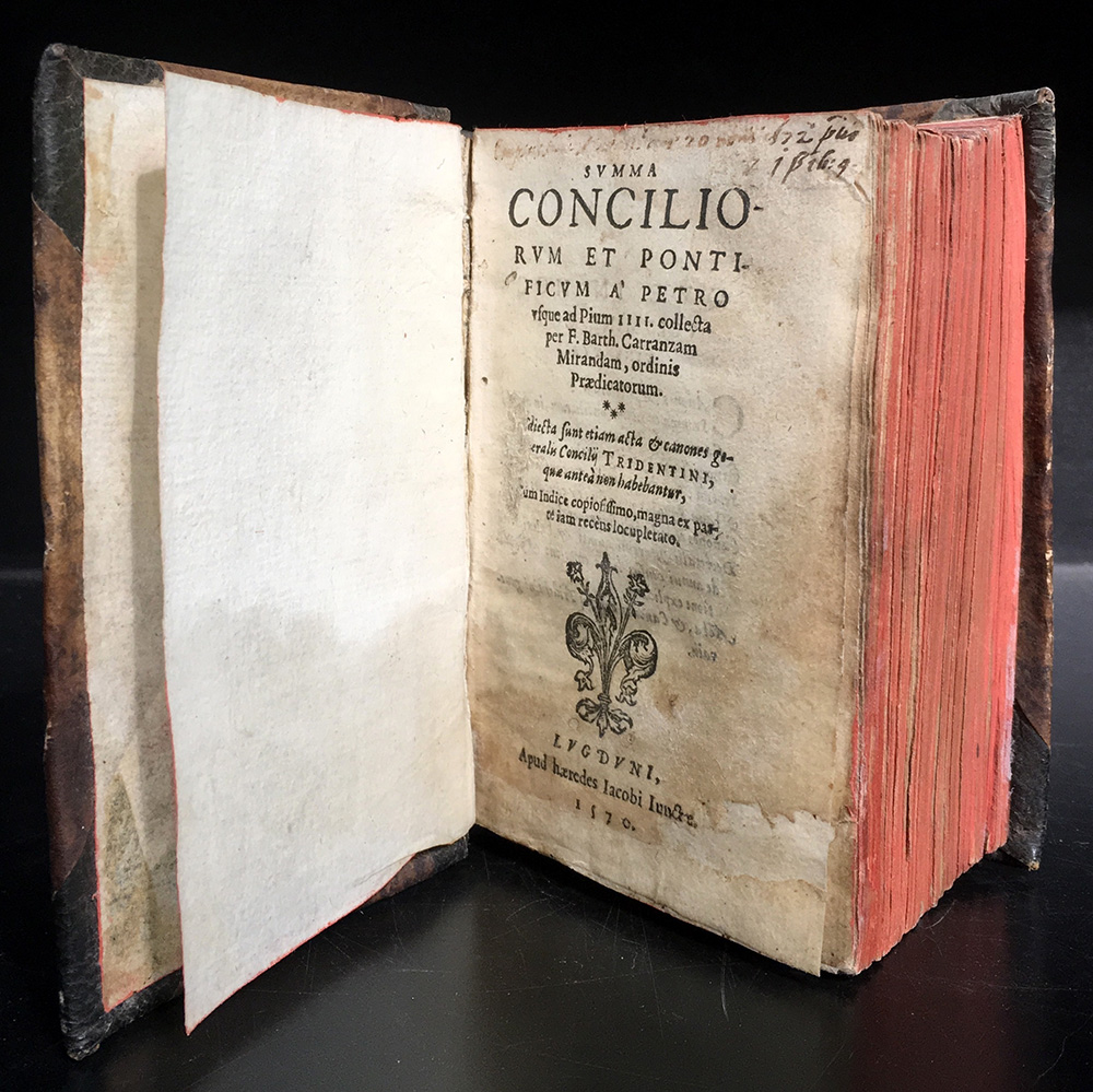 CARRANZA MIRANDA, Bartolomé. Summa Conciliorum et Pontificum a Petro usque ad Pium III collecta per F. Barth Carranzam Mirandam, ordinis Praedicatorum. Lione: Eredi di Jacopo Giunti, 1570. 16mo, mezza pelle del XVIII secolo, tagli rossi. Non collazionato e difetti da esaminare.
