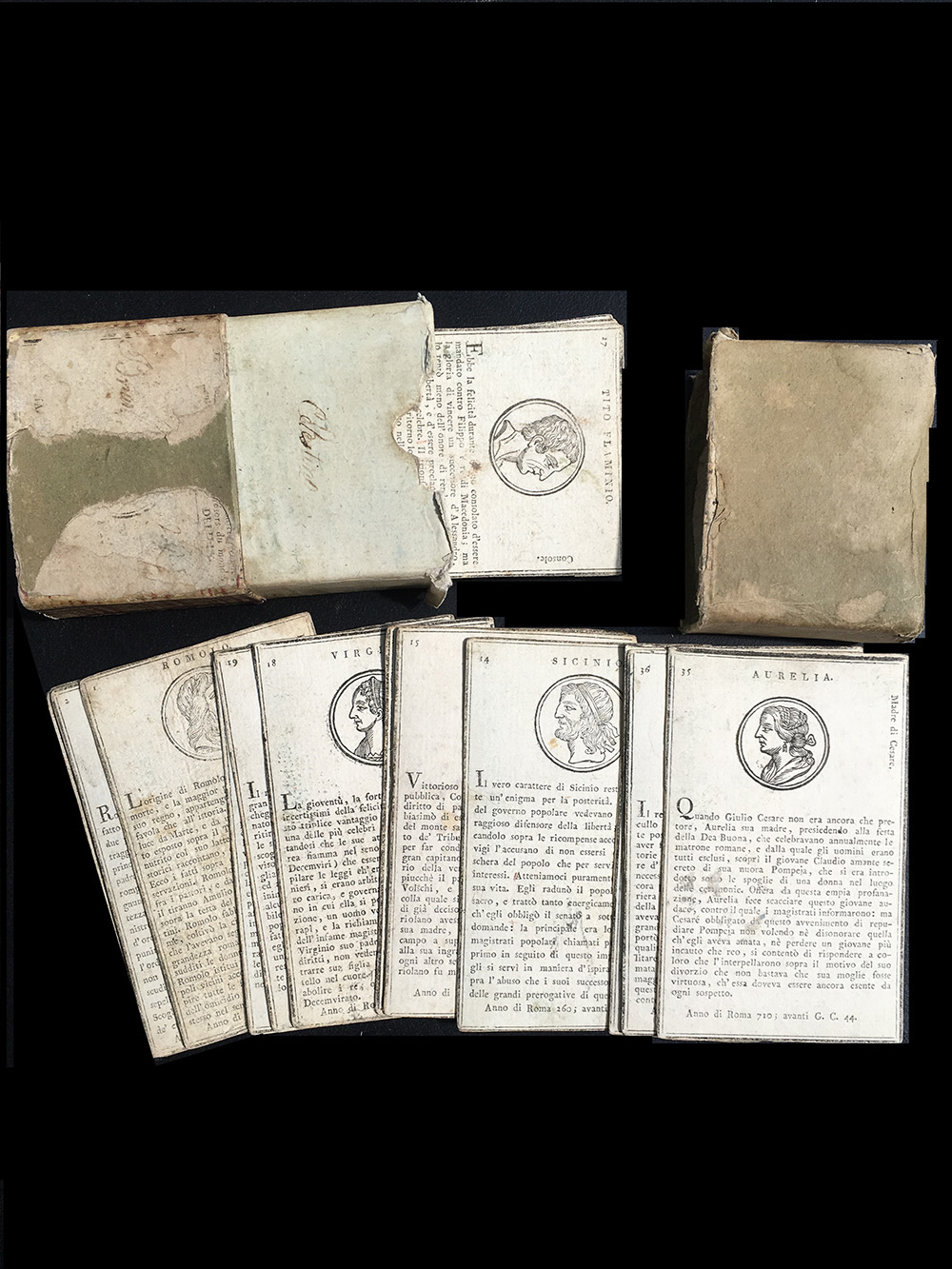 [CLASSICI] Un mazzo di carte di celebri personaggi della storia di Roma, XVIII secolo ca.. 41 carte numerate 1-41 (mancano la 6 e la 28). Entro custodia orginale (111 x 73mm). La prima carta è quella di Romolo. Non collazionato e difetti da esaminare.