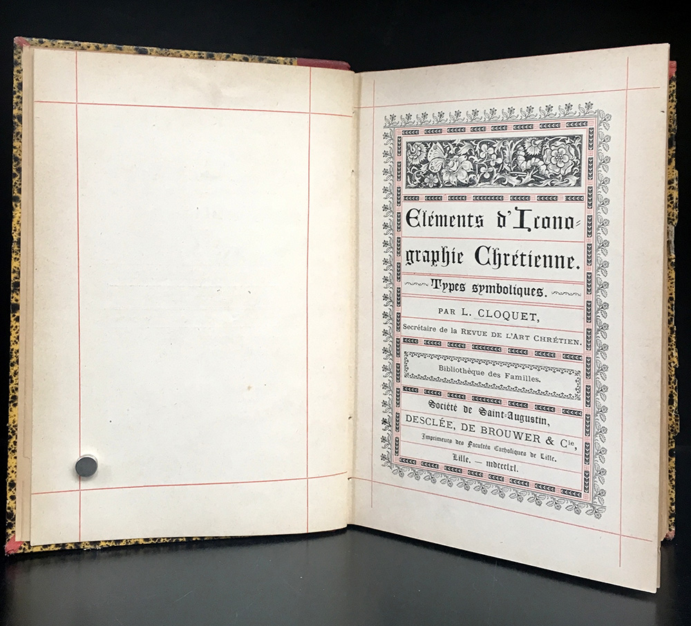 CLOQUET L. Elements d’iconographie chrétienne. Types symboliques, Lille: Desclée-De Brouwer, 1890. 8vo, numerose illustrazioni nel testo, legatura in mezza pelle. Non collazionato e difetti da esaminare.