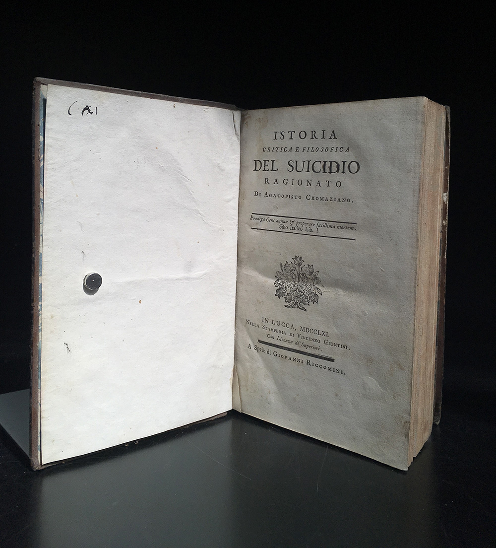 CROMAZIANO A. Istoria critica e filosofica del suicidio ragionato. Lucca: Giuntini, 1761, 8vo, legatura coeva in piena pelle con titolo in oro su tassello e fregi al dorso. Non collazionato e difetti da esaminare.