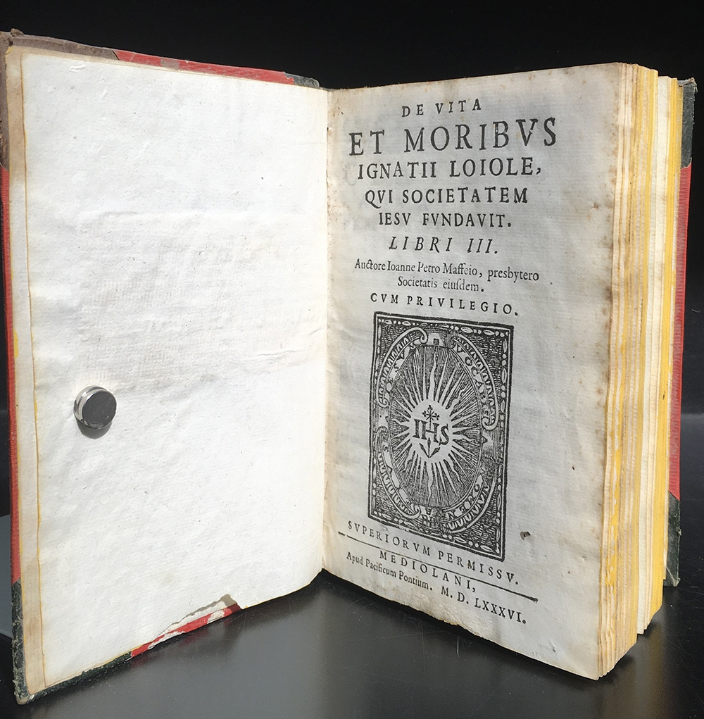 DE LOYOLA, Ignazio. De Vita et Moribus. Milano: Pacificum Pontium, 1586. 16mo, xilografia al frontespizio. Mezzo marocchino verde del XVIII secolo. Non collazionato e difetti da esaminare.
