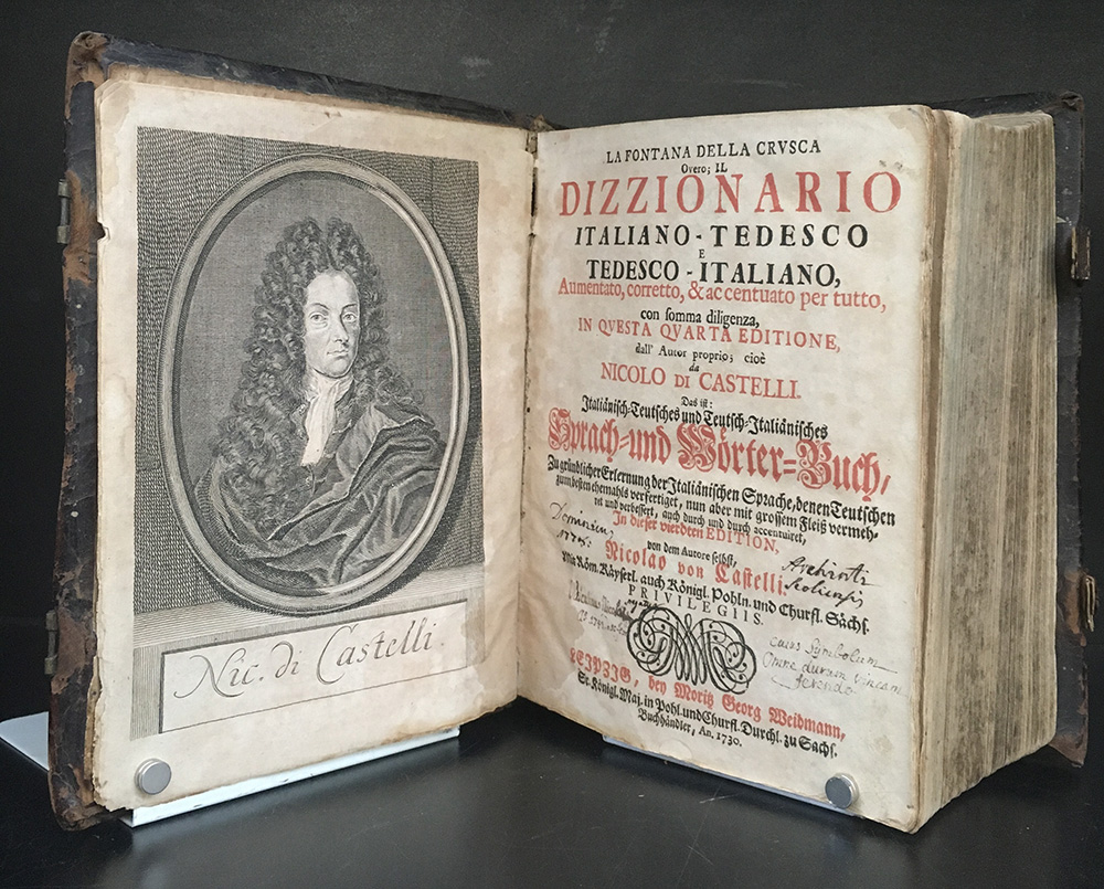 DI CASTELLI N. La fontana della crusca overo il Dizzionario italiano-tedesco e tedesco-italiano. Lipsia: Weidmann, 1730. 4to; ritratto. Legatura in tutta pelle antica. Non collazionato e difetti da esaminare.