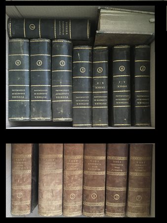 [DIRITTO] Lotto composto da :POTHIER R. G. Le pandette di Giustiniano. Venezia: Bazzarini, 1833. 8vo grande, 9 voll, legatura coeva in mezza pelle con titoli in oro al dorso; VOET G. Commento alle pandette. Venezia: Bazzarini, 1837. 8vo grande, 6 voll Legatura coeva in mezza pelle con titolo in oro al dorso. Bel lotto dedicato alla pandettistica che raccoglie due degli studi più completi in materia. Non collazionato e difetti da esaminare.