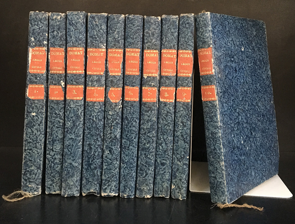 DOMAT J. Le leggi civili nel lor ordine naturale. Venezia: Zatta, 1802. 8vo, 10 voll, legatura coeva in cartonato marmorizzato con titolo in oro su tassello al dorso. Non collazionato e difetti da esaminare.