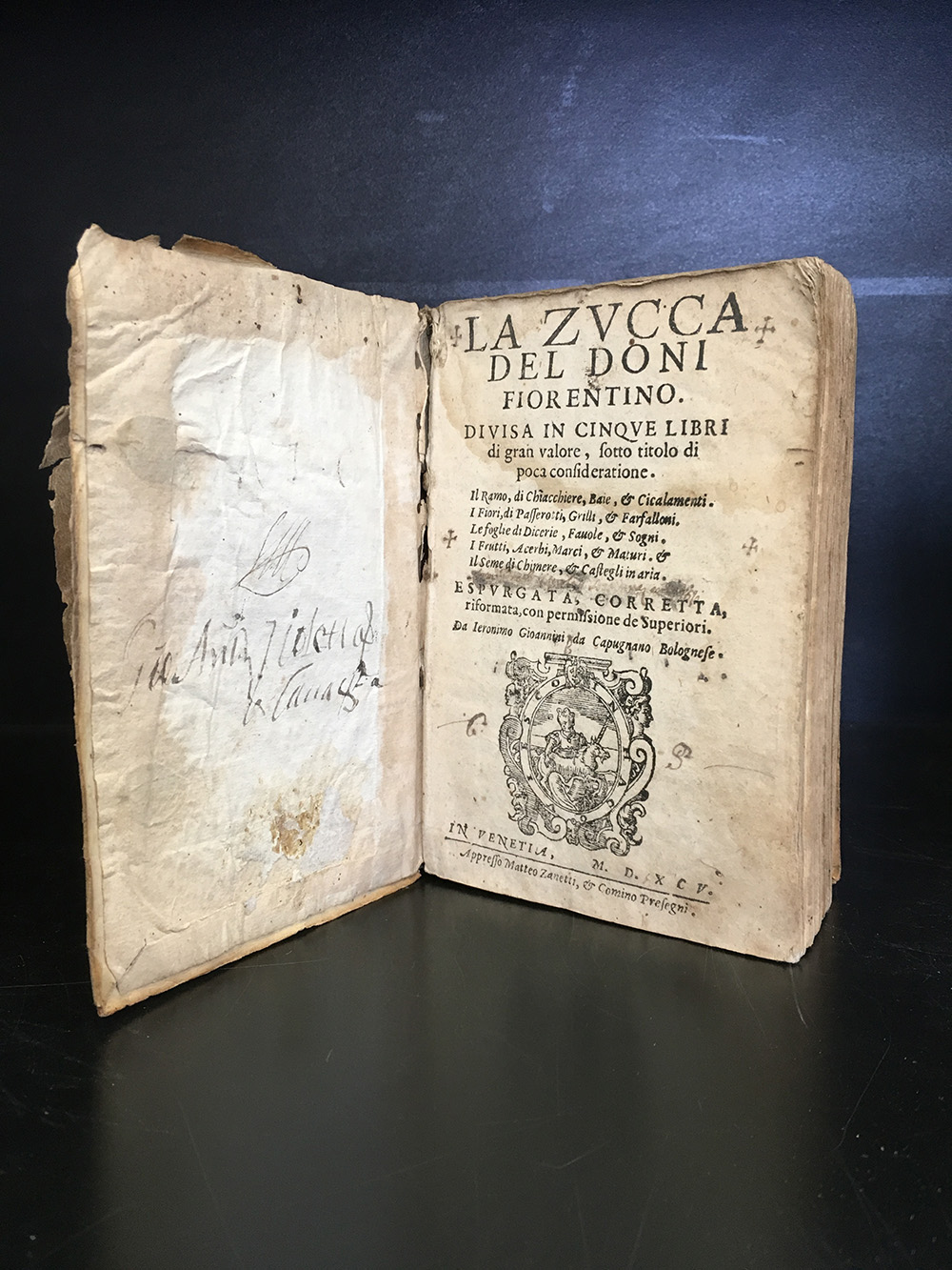 DONI Anton Francesco. La Zucca, Venezia, Zanetti, 1595. 8vo, legatura coeva in piena pergamena con titolo manoscritto al dorso. Non collazionato e difetti da esaminare.
