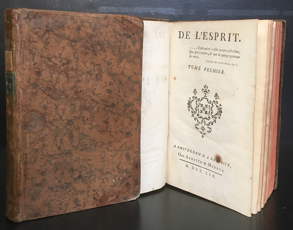 HELVETIUS, Claude-Adrien. De l'Esprit. Amsterdam e Lipsia, Arkstée e Markus, 1759. 2 volumi, 8vo. Pelle coeva a spruzzo, dorsi in oro e tagli rossi. Buona copia. Non collazionato e difetti da esaminare.