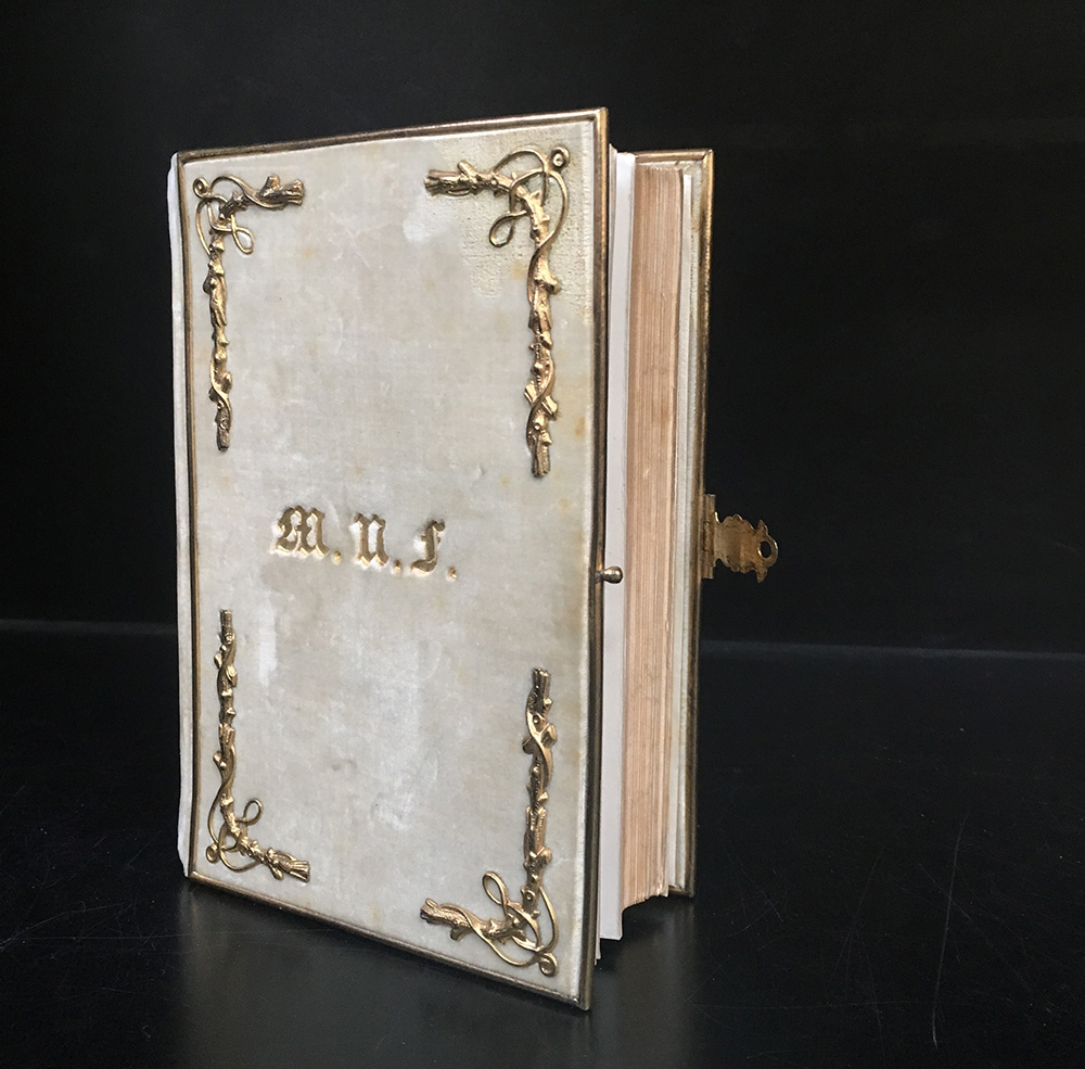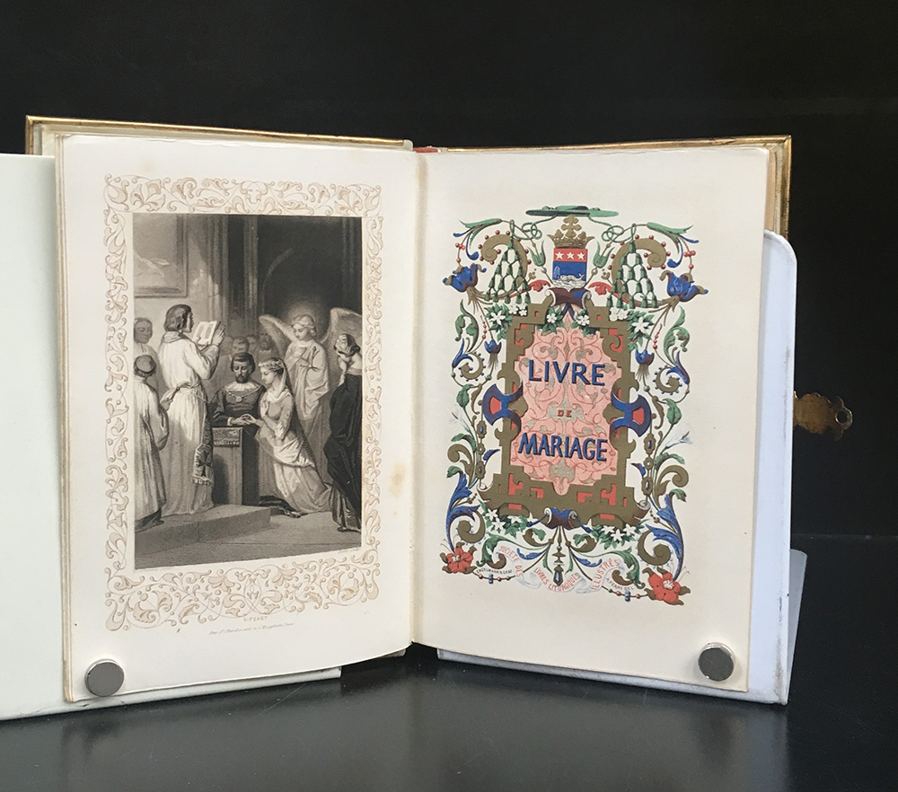 [LEGATURA] Livre de Marriage contenant la cérémonie des fiancailles, l’ordre de la celebration du marriage. Parigi: Plon, 1855. 12mo tavole, fregi e capilettera incisi stampati a colori. Legatura editoriale in velluto chiaro con fregi in bronzo con fermaglio e iniziali al centro del piatto anteriore tagli dorati. Non collazionato e difetti da esaminare.