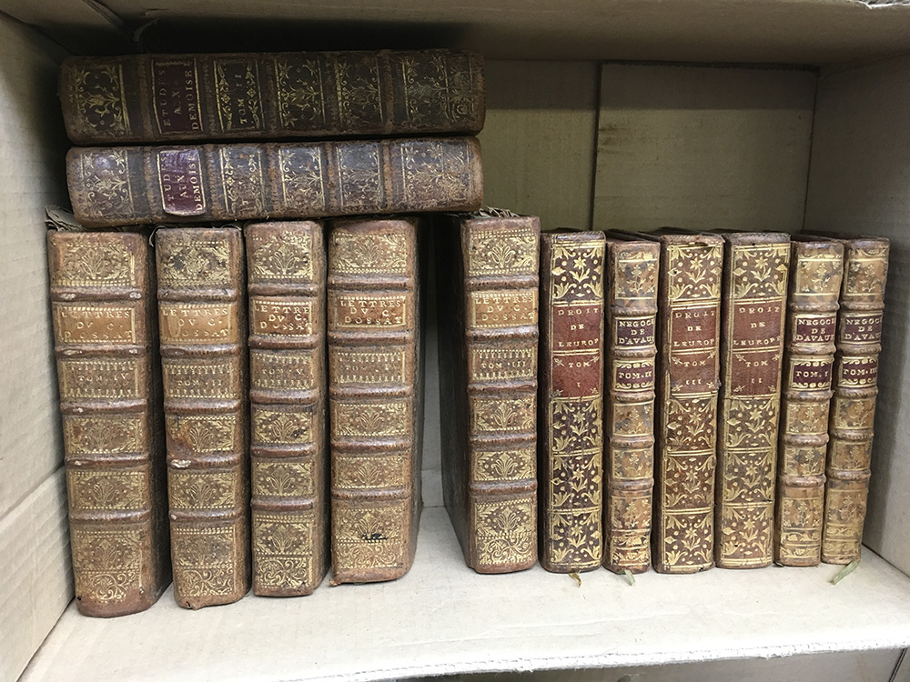 [LEGATURE - DIPLOMAZIA] Lotto di edizioni del XVIII secolo in piena pelle coeva con titolo e decori in oro al dorso. Si segnala: MABLY M. Le droit public de l'Europe. Geneve, compagnie des libraires, 1768; DE LA HOUSSAIE A. Letres du cardinal d'Ossat. Amsterdam: Humbret. 1714; Negociations de monsieur le comte d'Avaux en Hollande. Parigi: Durand, 1754. Non collazionato e difetti da esaminare.