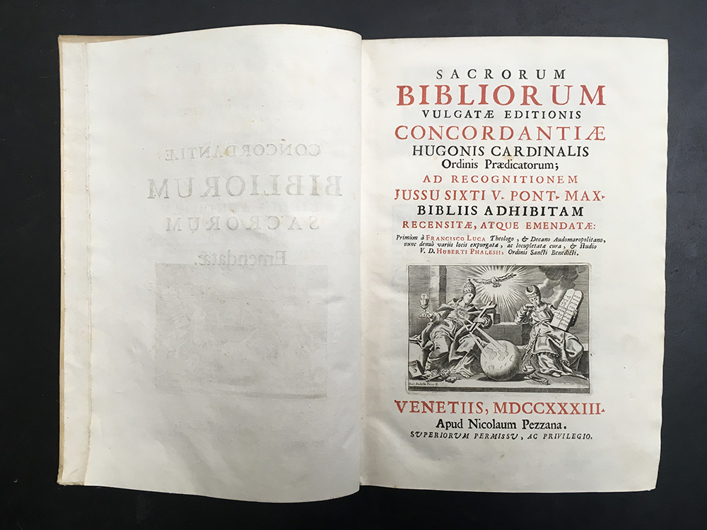 LUCA, Francesco. Sacrorum Bibliorum vulgatae editionis concordantiae. Venezia: Nicolo Pezzana, 1733. Folio, occhiello, titolo in rosso e nero con vignetta calcografica. Bella copia in pergamena coeva, tagli a spruzzo. Non collazionato e difetti da esaminare.