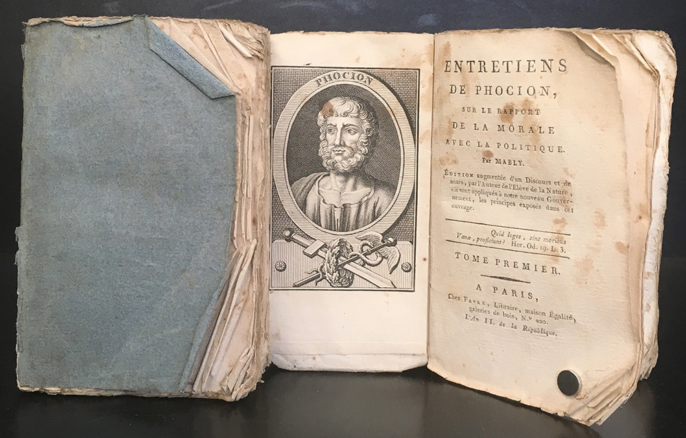 MABLY, G. B, Abbé de. Entretiens de Phocion, sur le rapport de la Morale avec la Politique. Parigi: s.d. 2 volumi, 16mo, brossura editoriale azzurra. Non collazionato e difetti da esaminare.